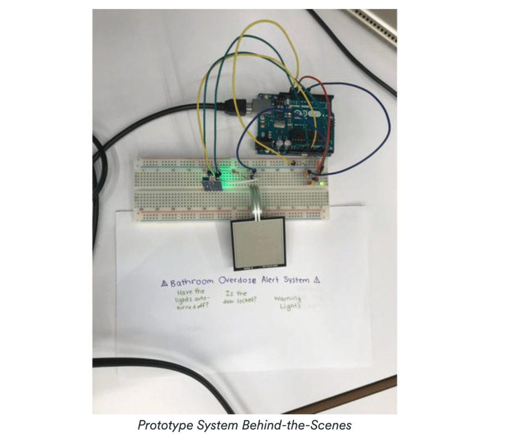 A Bathroom Overdose Alert System to prevent overdosed people in emergency bathrooms from passing out at Medical Hackathon Hack/ED