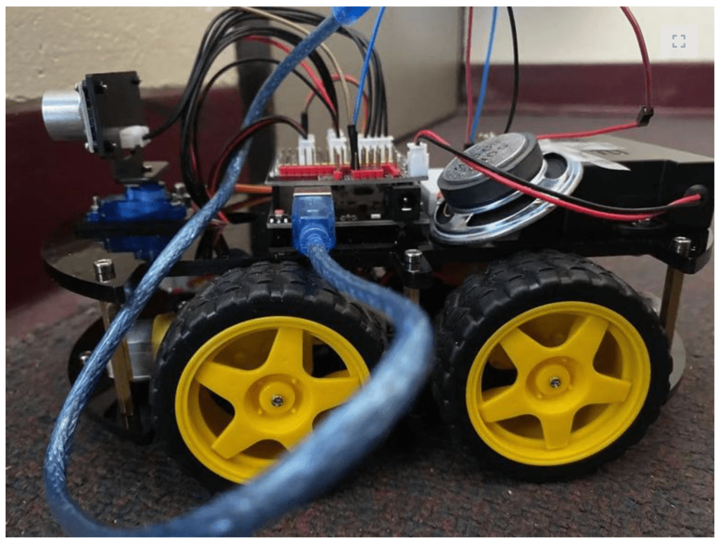 A robot car assembled and modified from ELEGOO robot car kit, that are able to automatically detect obstacles and play audio to inform people the direction of the obstacle.